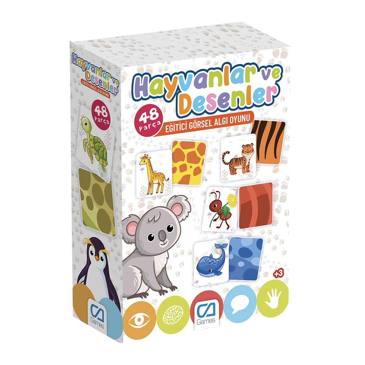Hayvanlar ve Desenleri HAYVANLAR VE DESENLERİ EĞİTİCİ KUTU OYUNU Hayvan Desenleri, karşımıza çıkan hayvanların deseninin hangisi olduğunu bulmaya çalıştığımız eğlenceli bir bulmaca oyunu. Oyunda karşımıza birbirinden farklı hayvanlar çıkıyor. Bu hayvanların desenlerini doğru tahmin etmeye çalışıyoruz. Çocukların algılama, karar verme, deneme-yanılma ve başarma duygularının gelişiminde katkı sağlar. Çocukların ince motor gelişimine katkı sağlar Çocukların zihinsel gelişimine katkı sağlar. Parça Sayısı 48 Adet Parça Ölçüsü: 6 x 6 cm Yaş Grubu : 3+ Yaş Barkodu: 8681889043627 Item No : CA.5155 Kutu Ölçüleri : 21,5 x 20 x 7 cm.