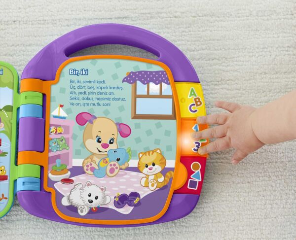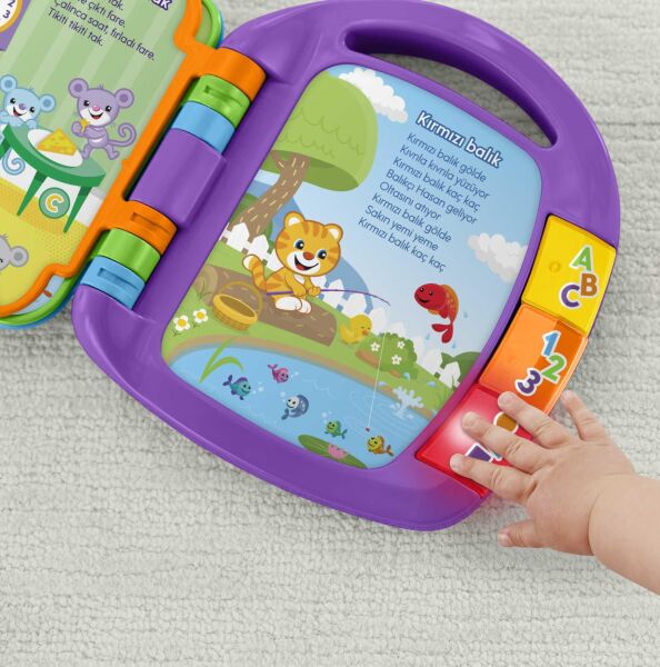 Eğlen ve Öğren® Eğitici Hikaye Kitabı ile en çok sevilen karakterler, bildiğiniz ve sevdiğiniz şarkılar ile bebeğinizi neşelendirir. 'Kırmızı Balık' 'Miniminnacık Örümcek' gibi sevilen şarkıları dinlemek için sayfaları çevirin. Bebeğiniz bu oyuncakla oynayıp şarkıları dinlerken sayı saymayı, temel kelimeleri, harfleri, rakamları, şekilleri ve çok daha fazlasını öğrenir. Kolay taşınabilen bir tutma kolu sayesinde, Eğitici Hikaye Kitabı'nı siz ve miniğiniz gittiğiniz her yere götürebilirsiniz! Erken gelişim için eğlenceli oyunlar™ Sayılar ve Harfler: Bebeğiniz ABC ve 123 düğmelerine bastığında, her sayfaya denk gelen ve onlara okumayı sevdiren harfleri ve sayıları duyacak! Renkler ve Şekiller: Bebeğiniz ışıklı Şekiller ve Renkler düğmesine bastığında, gördüğü farklı renkleri ve şekilleri ona öğreten cümleler duyacak!