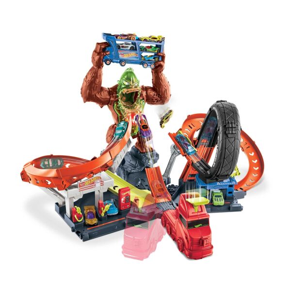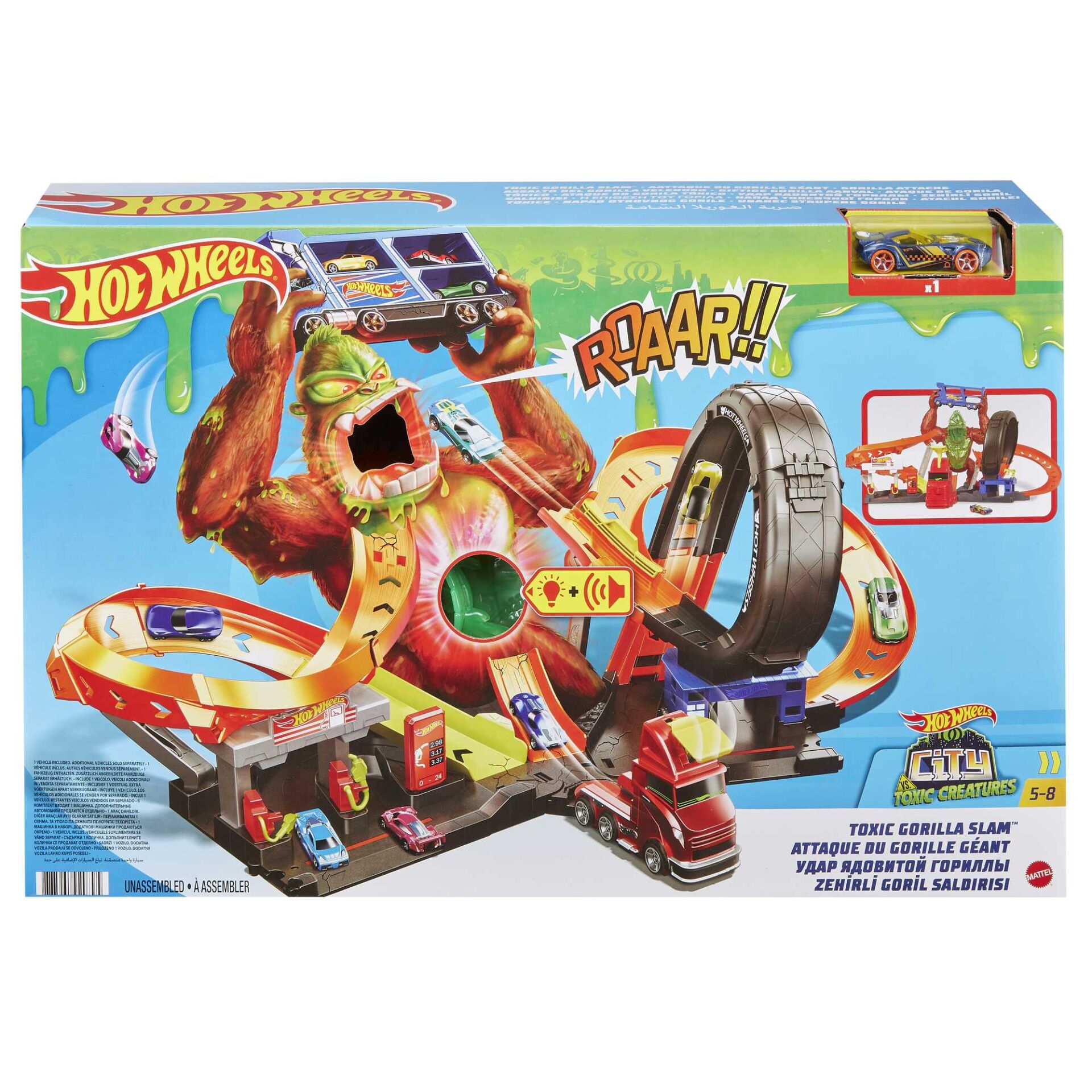 Zehirli bir goril, devasa bir taşıyıcı tır ile Hot Wheels™ Şehri benzin istasyonunu ve lastik tamiri dükkanını yıkmaya geliyor. Bu gorili yalnızca muhteşem akrobasi becerilerine sahip çocuklar durdurabilir. Dev oyun setinde, çok renkli ışıklar ve çeşitli seslerle öfkesini gösteren kötü canavarı alt etmek için üç akrobasi seçeneği sunan ayarlanabilir fırlatıcı bulunur. Arabayla keşfedebileceğiniz geniş bir alanın yanında bir adet 1:64 ölçekli Hot Wheels® aracı da sete dahildir. Hot Wheels® Zehirli Goril Saldırısı™, tabandaki birçok bağlantı noktasıy ile diğer Hot Wheels® setleri ile birleştirilebilir ve eğlence uzayarak artar. Renkler ve süslemeler çeşitlilik gösterebilir.