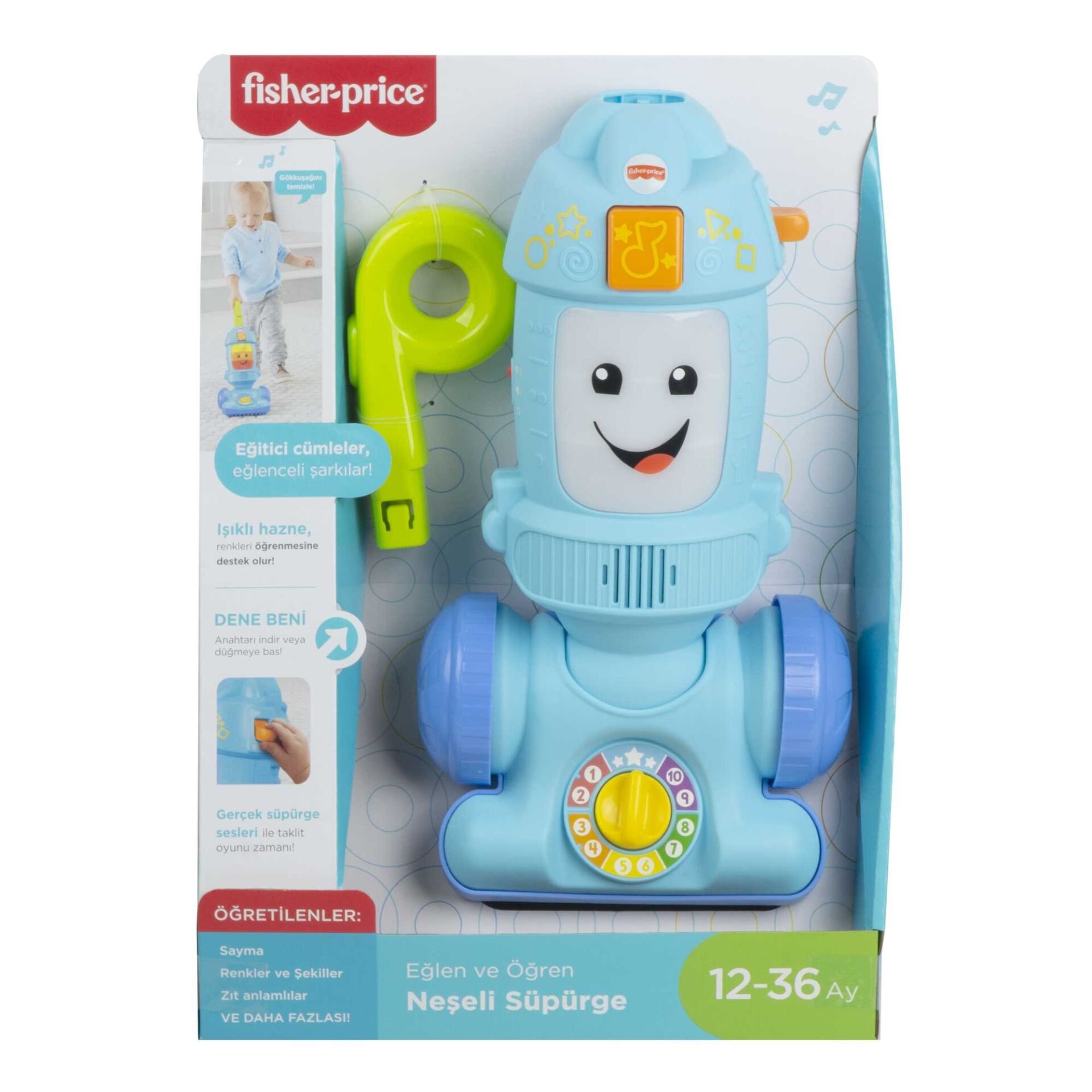 Fisher-Price® Eğlen ve Öğren® Işıklı Eğitici Süpürge® ile temizlik hiç bu kadar eğlenceli olmamıştı! Çocuğunuz, süpürge ile hareket edip oyuncağı ittiğinde süpürgenin ışıkları yanar. Eğitici içerikleri sayıları, renkleri ve daha birçok şeyi tanıtır. 'Güç' düğmesini yukarı kaldırdığınızda oyuncak, elektrikli süpürge sesi çıkarır ve minik yardımcınızı taklit oyununa alıştırır.