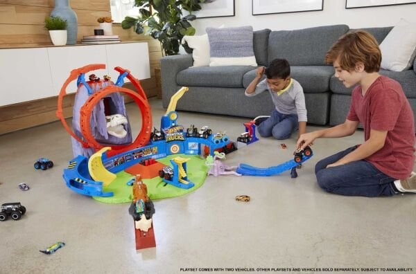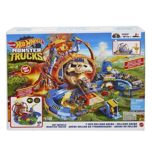 Hot Wheels® Monster Trucks Volkanik Alanda Macera, Monster Trucks hayranlarının beklentisini ikiye katlayacak bir oyun setidir! Fantastik ve klasik dünyaları mükemmel bir şekilde dengeleyen alanda, çocukları sevdikleri mücadele ortamı ve aksiyon ile buluşturmak için bir adet dev yanardağ, bir adet düşman T-Rex, iki adet büyük çember, fırlatıcılar ile çok sayıda çarpıştırma, ezme, akrobasi ve ters takla alanı bulunur. Öfkeli dinozor T-Rex, muhteşem ışık ve ses efektleri ile yanardağdan fırladığında kahramanlık becerilerinizi konuşturun ve lavların arasından sıyrılarak dinozoru alt etmeye çalışın! Kutudan çıkar çıkmaz aksiyona atılmanızı sağlayacak bu sette 1 adet 1:64 ölçekli Hot Wheels® Race Ace™ Monster Truck aracı ve 1 adet 1:64 ölçekli Hot Wheels® arabası bulunur. Alandaki 'garajlar', daha fazla araç için saklama alanı sunar. Bu seti diğer Hot Wheels® pistleri ile birleştirerek devasa bir oyun alanı oluşturabilir ve çocukların saatlerce oyun oynayarak hayal güçlerini geliştireceği heyecan verici bir dünyanın kapılarını aralayabilirsiniz! Renkler ve süslemeler çeşitlilik gösterebilir.