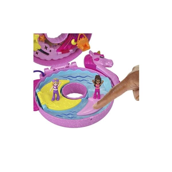 Bu Polly Pocket Unicorn Floatie Compact, Micro Polly bebeği ve arkadaşıyla büyülü bir havuz partisine açılıyor!