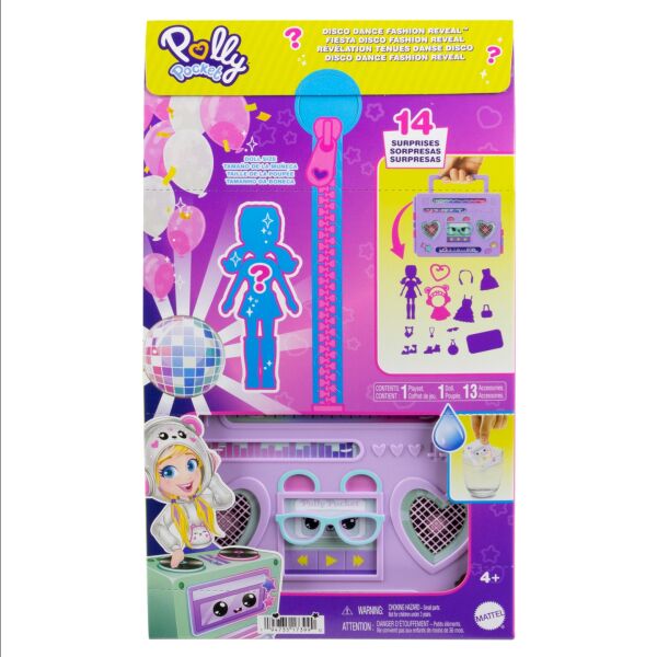 Üç sürprizli harika partide, içinde aksesuarların saklı olduğu, suda çözünebilen kağıt kese ve kilitli dolabın arkasında saklanan 8 cm'lik Polly Pocket'a uygun DJ temalı özel bir takılabilir kapüşon bulunur. Çocuklar, oyun setinin içinde ve dışında dans pisti maceralarını canlandırabilir ve seti kolayca toparlayıp taşıma sapıyla istedikleri yere götürebilir!
