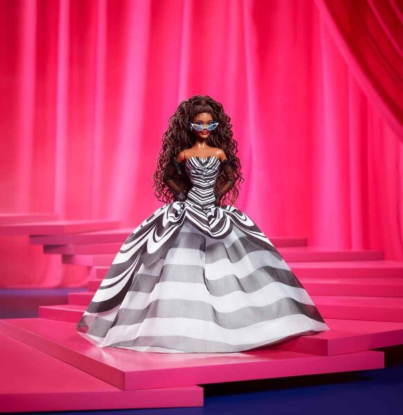 Barbie, orijinal Barbie bebeğin klasik ayrıntılarını modern ve zarif bir dokunuşla yeniden yorumlayan, koleksiyona uygun güzel bir bebekle 65. yıl dönümünü kutluyor. Bebek, orijinal Barbie bebeğin giydiği mayodan ilham alan siyah ve beyaz bir elbise giymektedir. Üzerine tam oturan bluzu, çizgi desenli hacimli elbisesi ile dikkat çeker. Örgülü uzun atkuyruğu, kedigözü şekilli güneş gözlüğü, mavi farı ve kırmızı dudakları ile ilk Barbie'ye atıfta bulunur. Uzun siyah eldivenleri, muhteşem görünümüne zarafet katar. Barbie bebek, bu önemli dönüm noktasını kutlamak için 65. yıl dönümlerini temsil eden safirden ışıltılı küpeler takar. Tüm Barbie severler onun şıklığına hayran kalacak!
