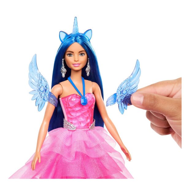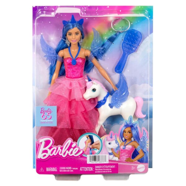 Barbie'nin 65. yıl dönümünü bu göz alıcı bebekle kutlayın! 'Barbie A Touch of Magic' dizisindeki karakterinden ilham alınarak tasarlanan bebek, renk geçişli pembe elbisesiyle göz kamaştırıyor. Masmavi saçları, tacı, kollarındaki kanatları ve çıkarılabilir kuyruğu, zarif görünümüne muhteşem bir hava katıyor. Aksesuarlar arasında gümüş küpeler, bant detaylı topuklu ayakkabılar, saç fırçası ve efsanevi kanatlı unicorn figürü yer alıyor. Bebek tek başına ayakta duramaz. Renkler ve süslemeler çeşitlilik gösterebilir.