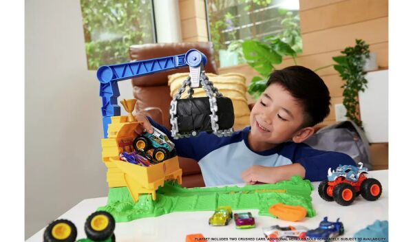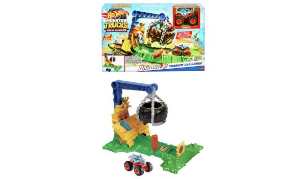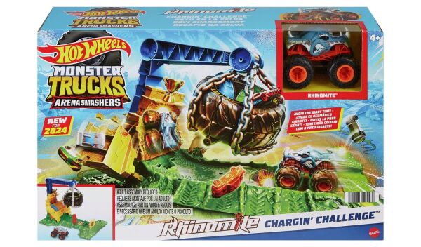 Hot Wheels Monster Trucks Arenada Rhinomite Mücadelesi Oyun Seti'nde Rhinomite ile engelleri yıkıp aşın ve dev lastikle çarpışıp ezilmekten kaçının! Belirlenmiş çarpma noktalarını hedefleyin, tribünleri yarıp geçin ve sürpriz kupayla zaferinizi kutlayın. Yukarıda sallan lastik, Rhinomite'yi kapana kıstırıp ezmeye hazır! Lastiği hurda arabalar ve diğer oyuncak araçlarla doldurarak lastik açılınca ortaya çıkan tahribat ve heyecan dozunu artırın. Mücadele ve hikaye seçeneklerini zenginleştirmek için diğer Monster Trucks Çarpışma Arenası setlerine eklenebilir.